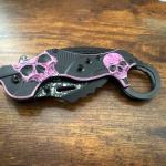 Spring assisted pocket knife with pink skulls has pocket clip… Read More →